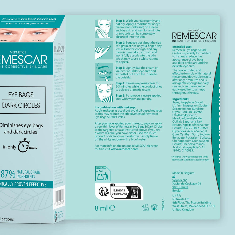Remescar Tränensäcke & Augenringe – Sofort-Effekt-Creme reduziert sichtbar Tränensäcke und Augenringe in nur 2 Minuten – schon nach der ersten Anwendung. Die Wirkung hält bis zu 8 Stunden an. Die neue, besonders sanfte Formel mit 87 % natürlichen Inhaltsstoffen ist ideal für die empfindliche Augenpartie und lässt sich problemlos mit Make-up kombinieren – ganz ohne Spannungsgefühl.