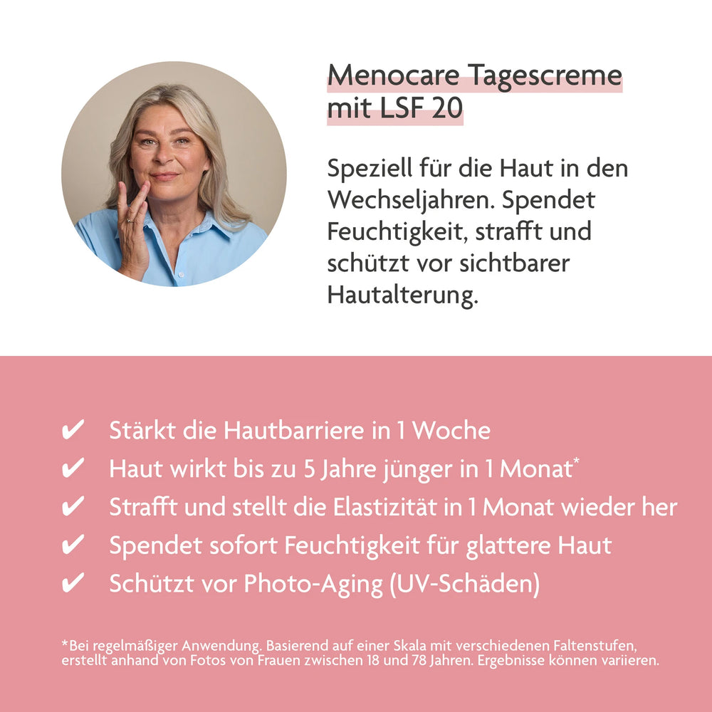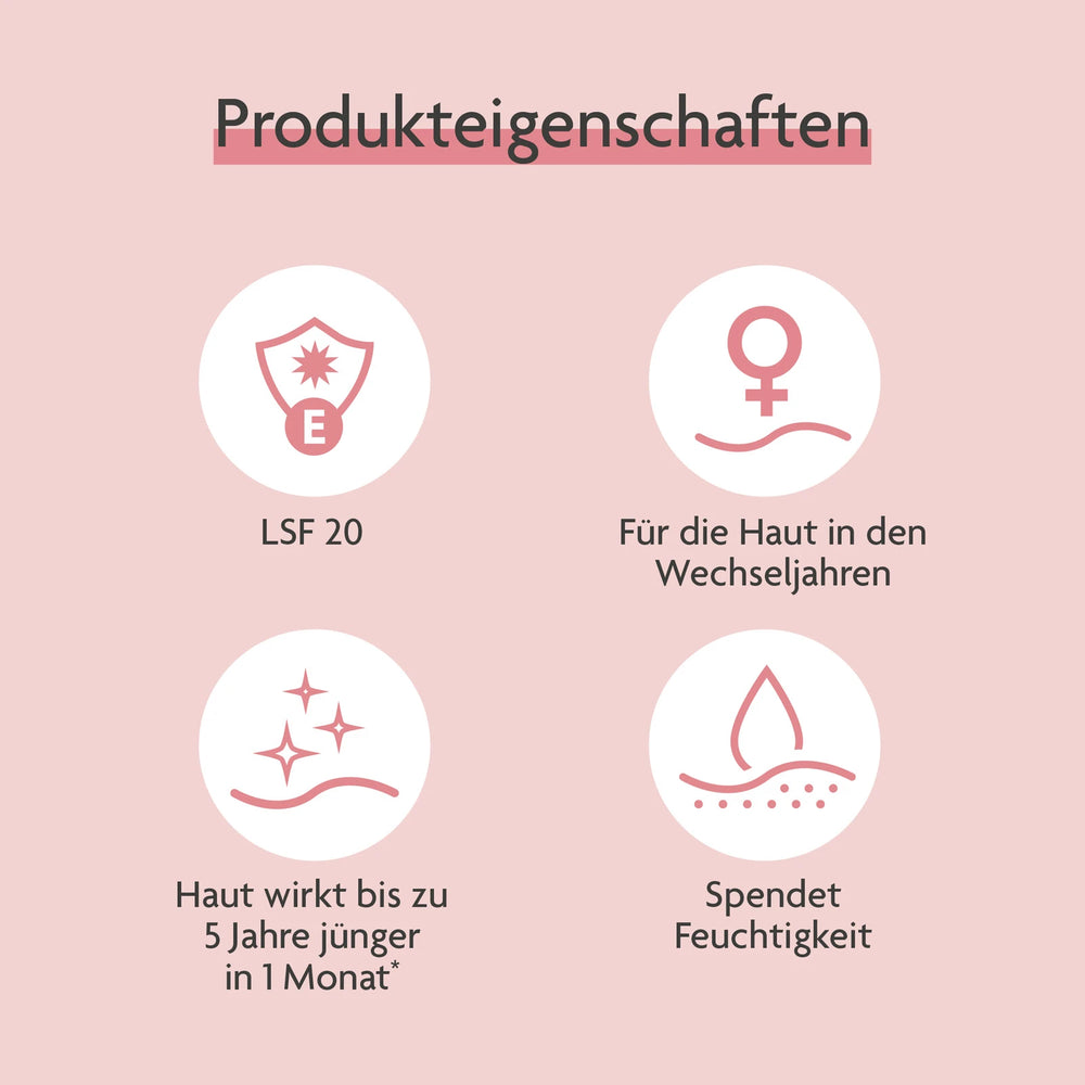 Eine kraftvolle Tagescreme, die speziell entwickelt wurde, um deine Haut in den Wechseljahren intensiv zu hydratisieren, zu festigen und zu schützen. Mit einer Kombination aus wissenschaftlich fundierten Inhaltsstoffen hilft diese Creme, sichtbare Zeichen der Hautalterung wie feine Linien, Trockenheit und Elastizitätsverlust zu mindern - für eine strahlende und widerstandsfähige Haut.