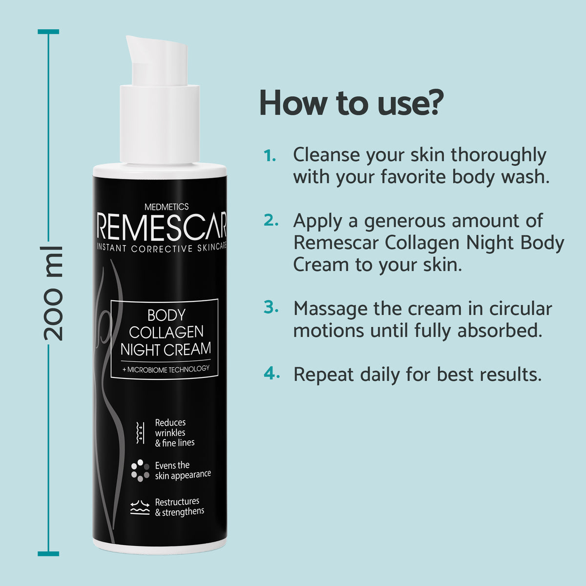 Remescar Body Collagen Night Cream is a powerful, restorative body cream that deeply nourishes your skin while you sleep. The innovative Colla-ceutical technology boosts collagen production, improves skin texture, and visibly reduces wrinkles and fine lines. The formula, enriched with Microbiome Technology and Pure Retinol, helps achieve a youthful, radiant skin by reducing signs of aging and firming the skin. Wake up every morning with noticeably softer, smoother, and more radiant-looking skin.