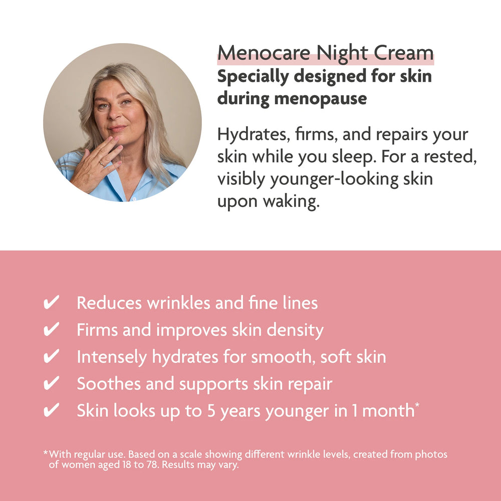 A restorative night cream specially developed to intensely nourish, firm, and smooth the skin during menopause. While you sleep, this formula works deep within the skin to reduce signs of aging such as wrinkles, loss of elasticity, and a dull, uneven tone. The result? You wake up with visibly smoother and younger-looking skin.