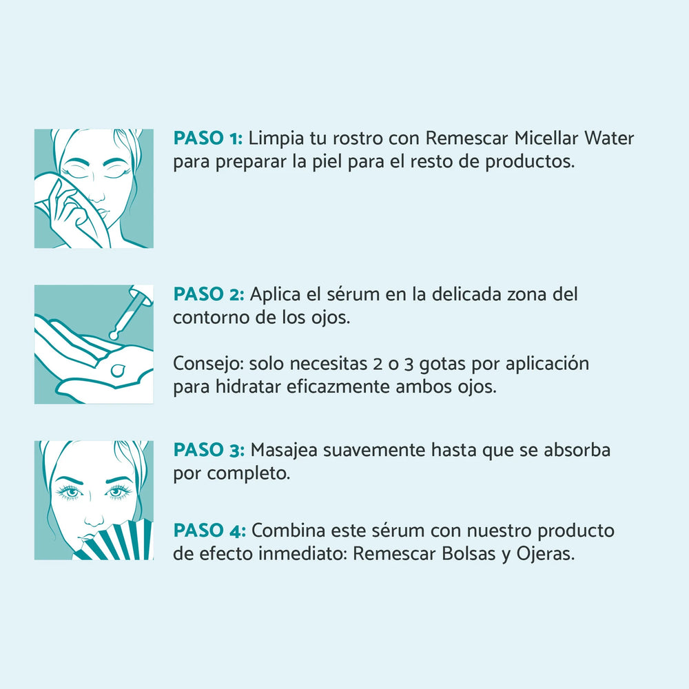 Remescar Sérum Hidratante Contorno de Ojos ha sido desarrollado para cuidar la delicada zona bajo los ojos. Su potente fórmula hidratante nutre la piel en profundidad, mejora su elasticidad y reduce visiblemente las líneas de expresión.