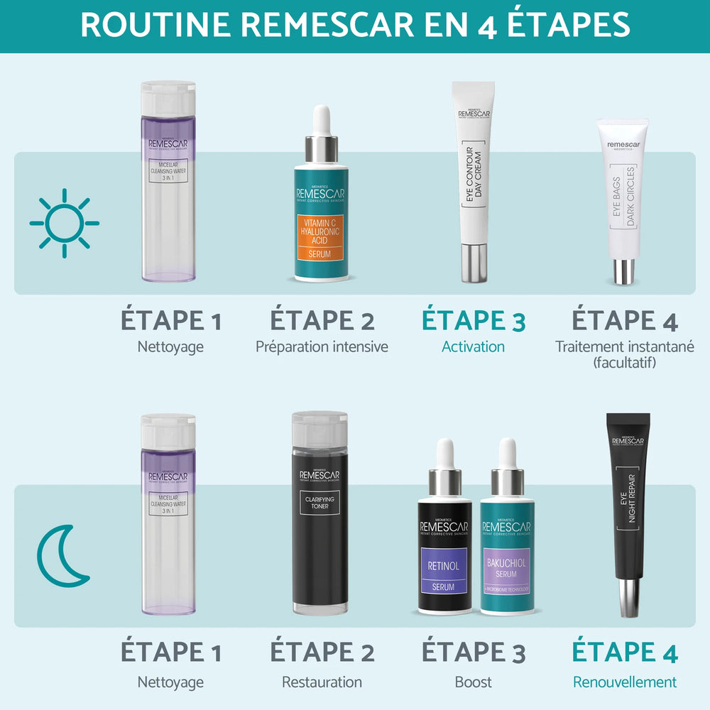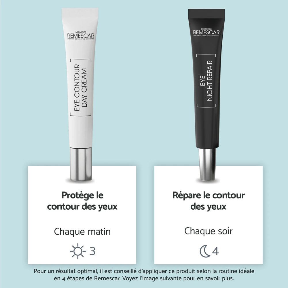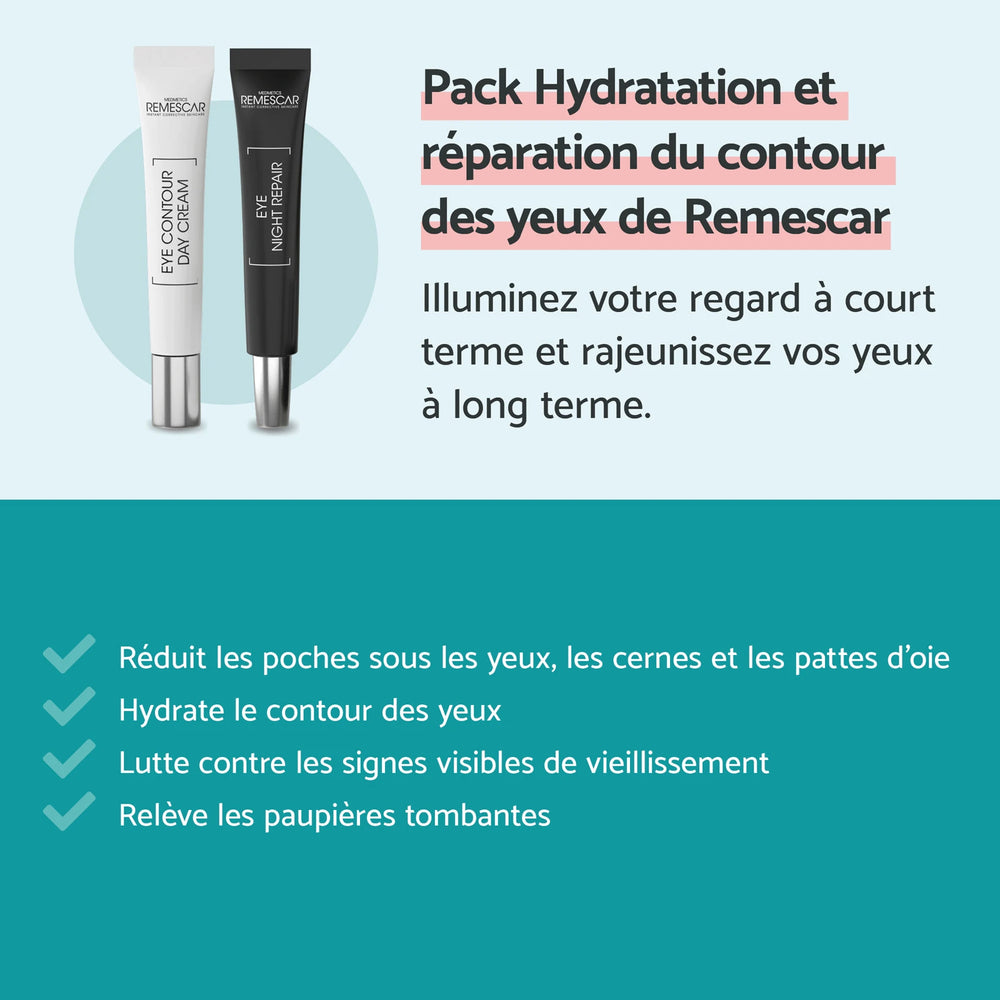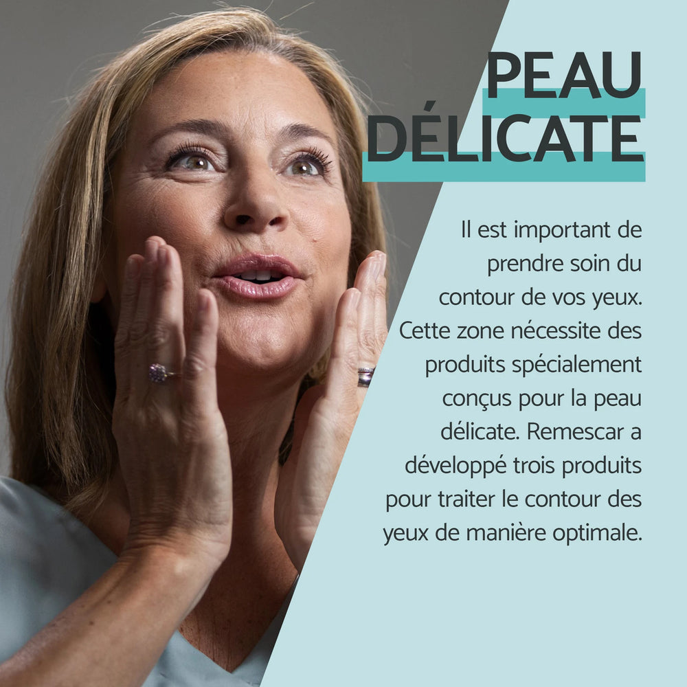 Le Duo Soin Contour des Yeux Hydratant & Réparateur de Remescar associe la Crème de jour pour le contour des yeux et le Soin de Nuit Réparateur pour le Contour des Yeux. Ensemble, ils hydratent, raffermissent et réparent la peau délicate du contour des yeux. Le regard paraît plus frais, plus ferme et plus lumineux.