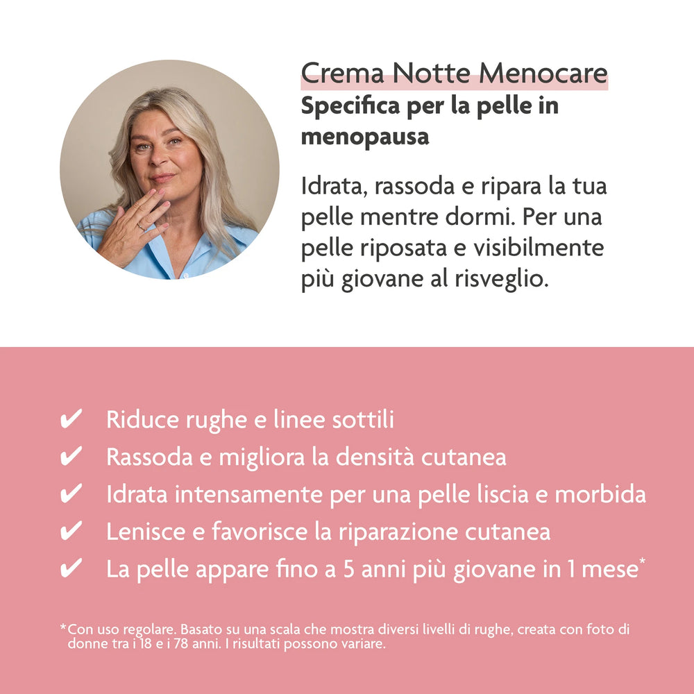 Una crema notte rigenerante sviluppata appositamente per nutrire, rassodare e levigare intensamente la pelle durante la menopausa. Mentre dormi, questa formula agisce in profondità contro i segni dell’invecchiamento come rughe, perdita di elasticità e incarnato spento e irregolare. Il risultato? Ti svegli con una pelle visibilmente più liscia e giovane.